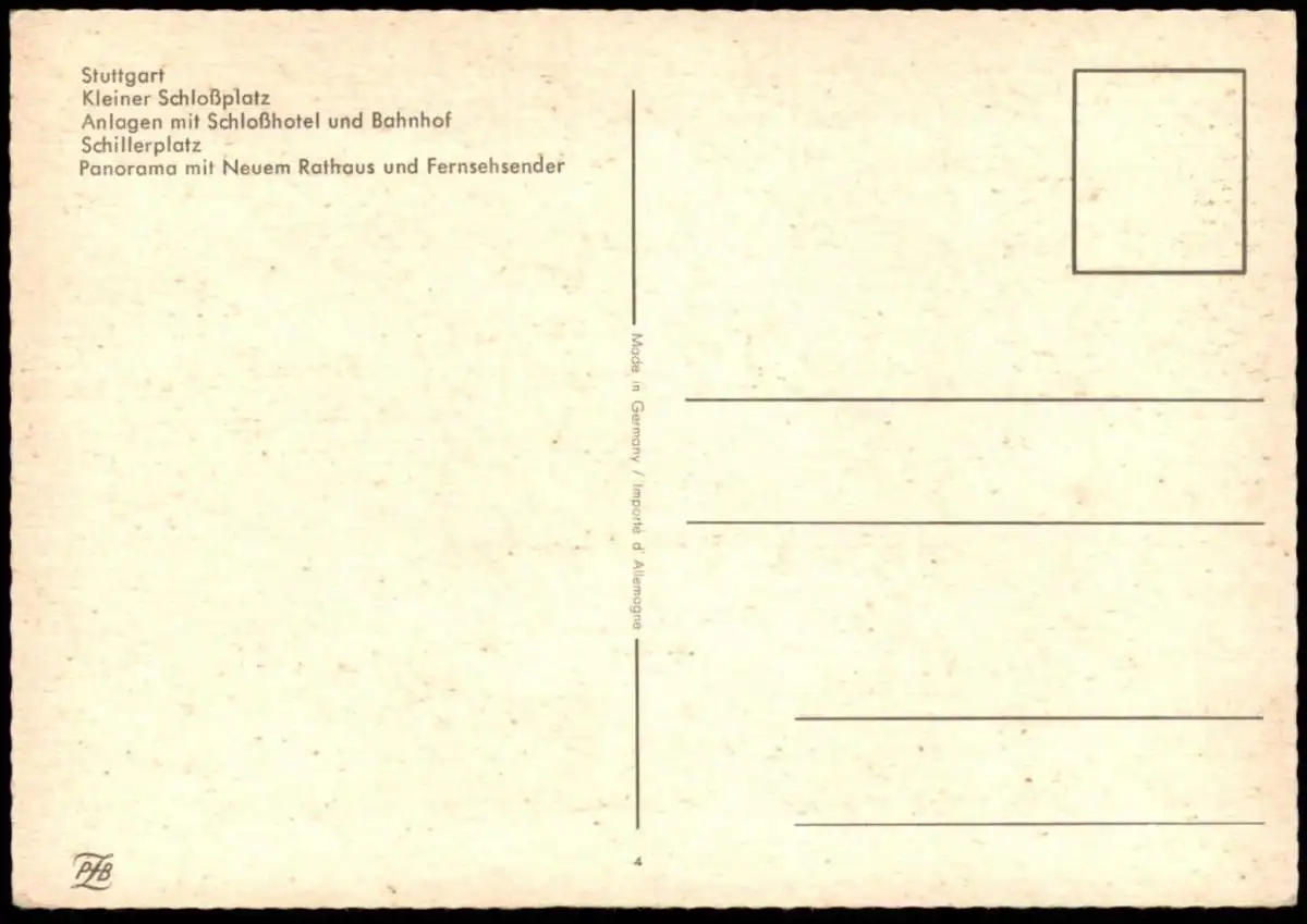 ÄLTERE POSTKARTE GRÜSSE AUS STUTTGART KLEINER SCHLOSSPLATZ ANLAGEN MIT SCHLOSSHOTEL UND BAHNHOF SCHILLERPLATZ PANORAMA MIT NEUEM RATHAUS UND FERNSEHSENDERVerlag: PfB