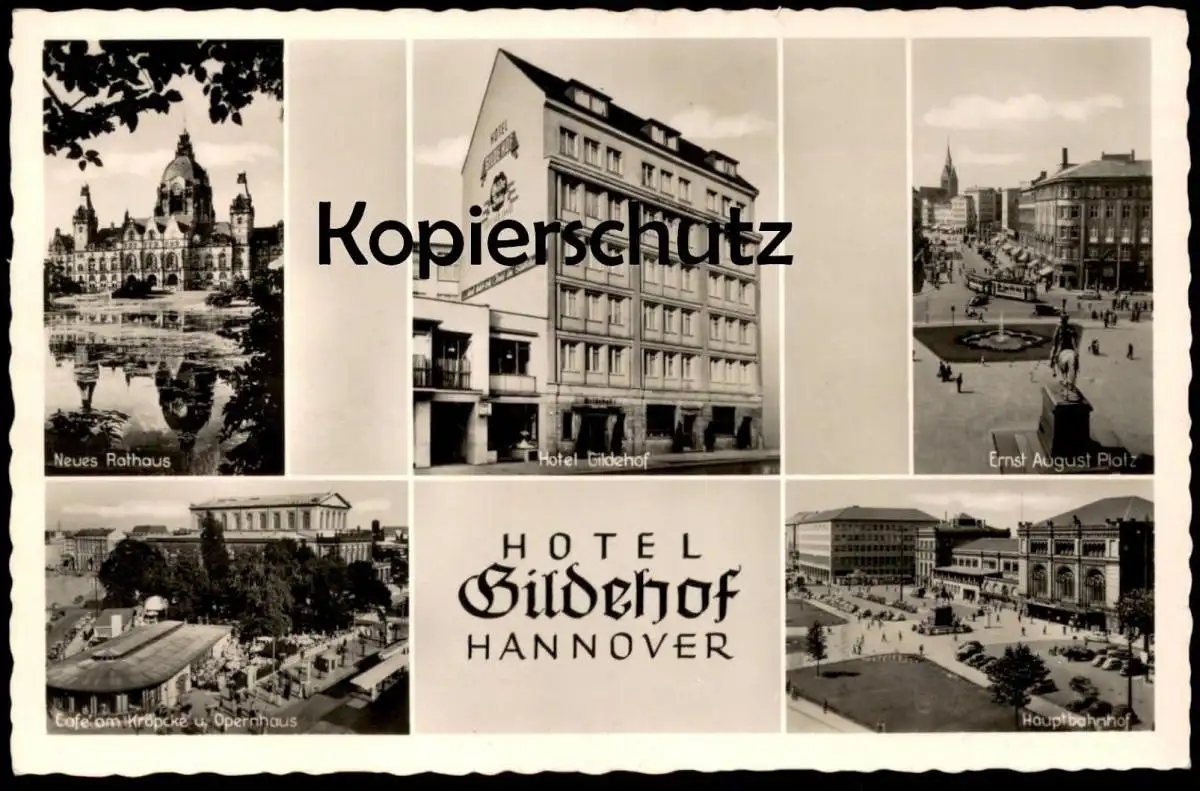 ÄLTERE POSTKARTE HANNOVER HOTEL GILDEHOF HAUPTBAHNHOF ERNST AUGUST PLATZ NEUES RATHAUS CAFÉ AM KRÖPCKE UND OPERNHAUS GILDE HOF GILDEBRÄU INH. KARL BÜCKEN JOACHIMSTR. 6 Verlag: H. Lukow, Hannover, Vahrenwalder Str. 46 A