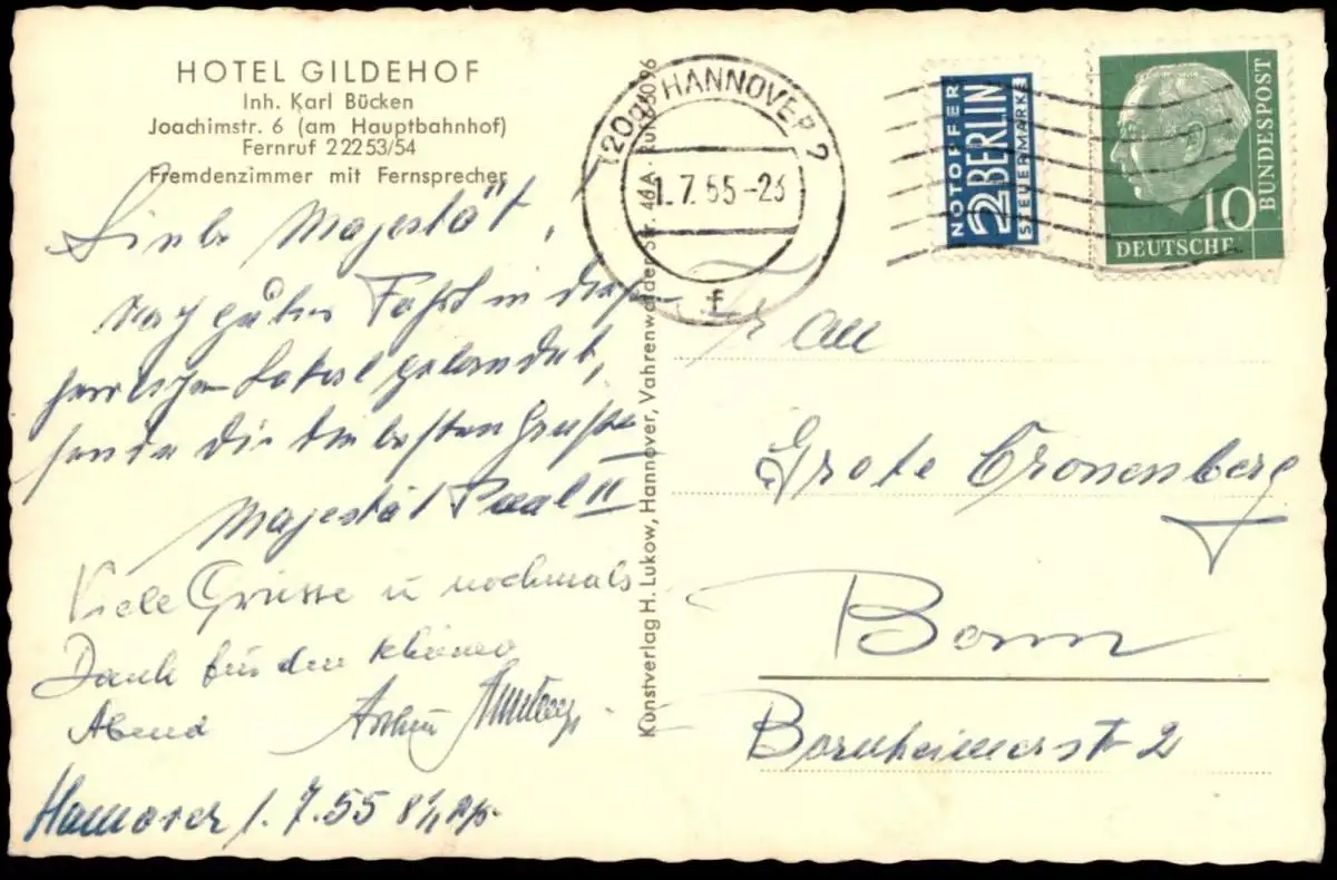 Gelaufen: 01.07.1955 mit Stempel Hannover 2 nach Bonn