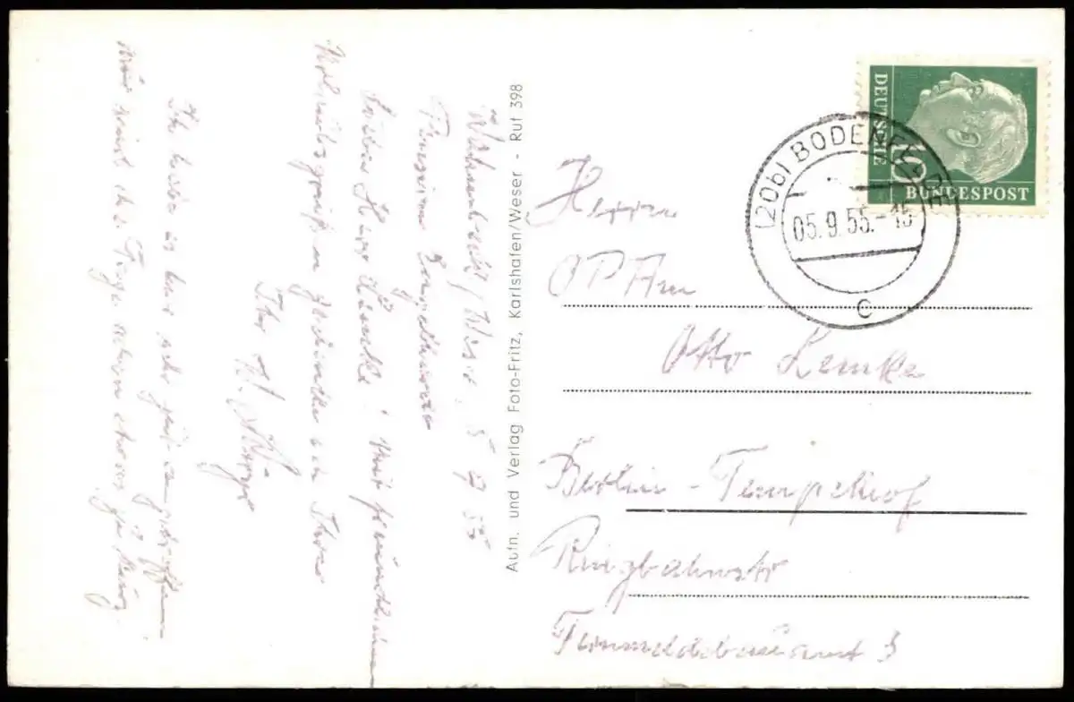 Gelaufen: 05.09.1955 mit Stempel Bodenfelde nach Berlin Tempelhof