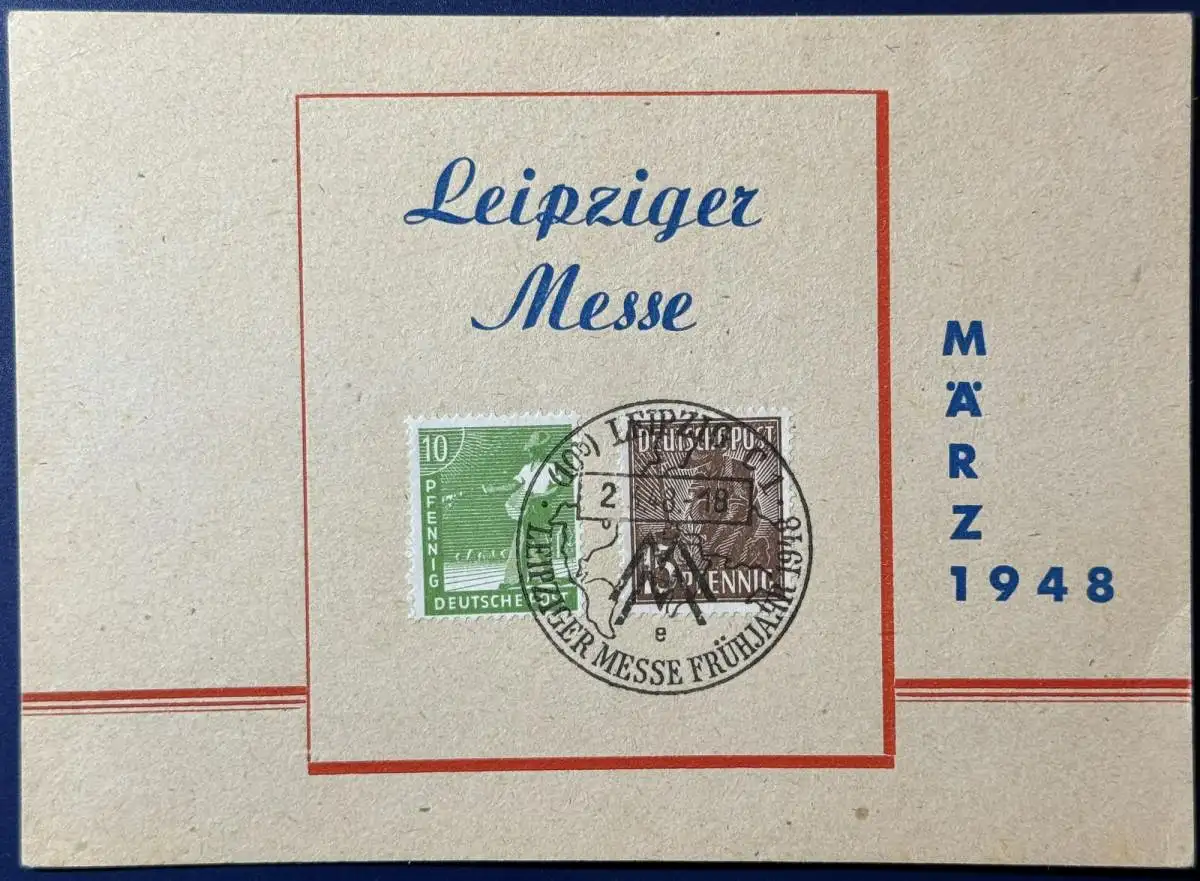Sonderkarte Leipziger Messe, 1948, ungelaufen, frankiert mit Mi.Nr. 946 und 948, entwertet mit Sonderstempel vom 02.03.1948, Karte ist sehr gut erhalten.