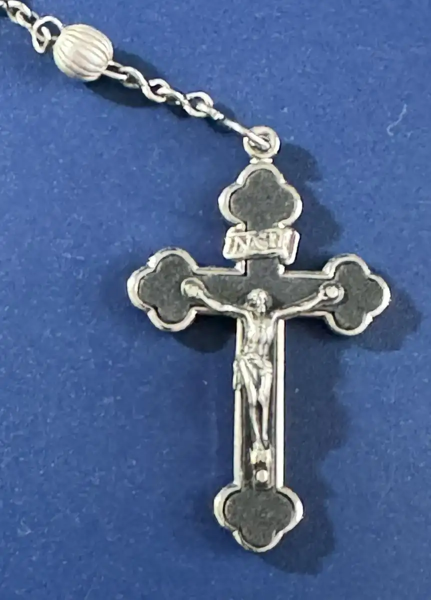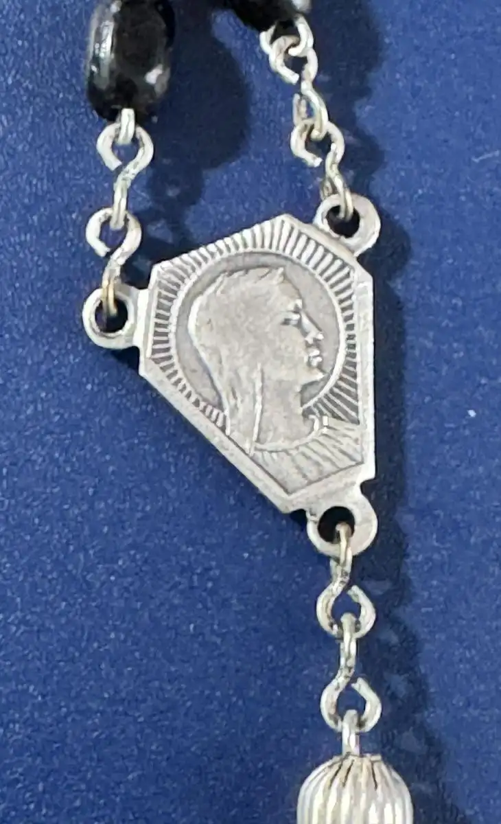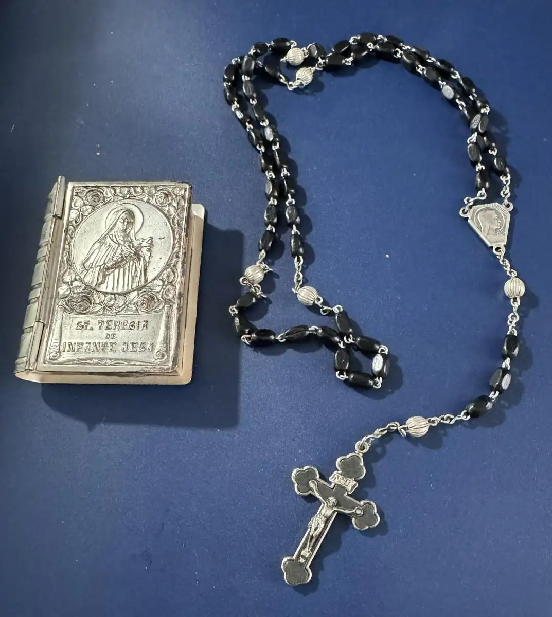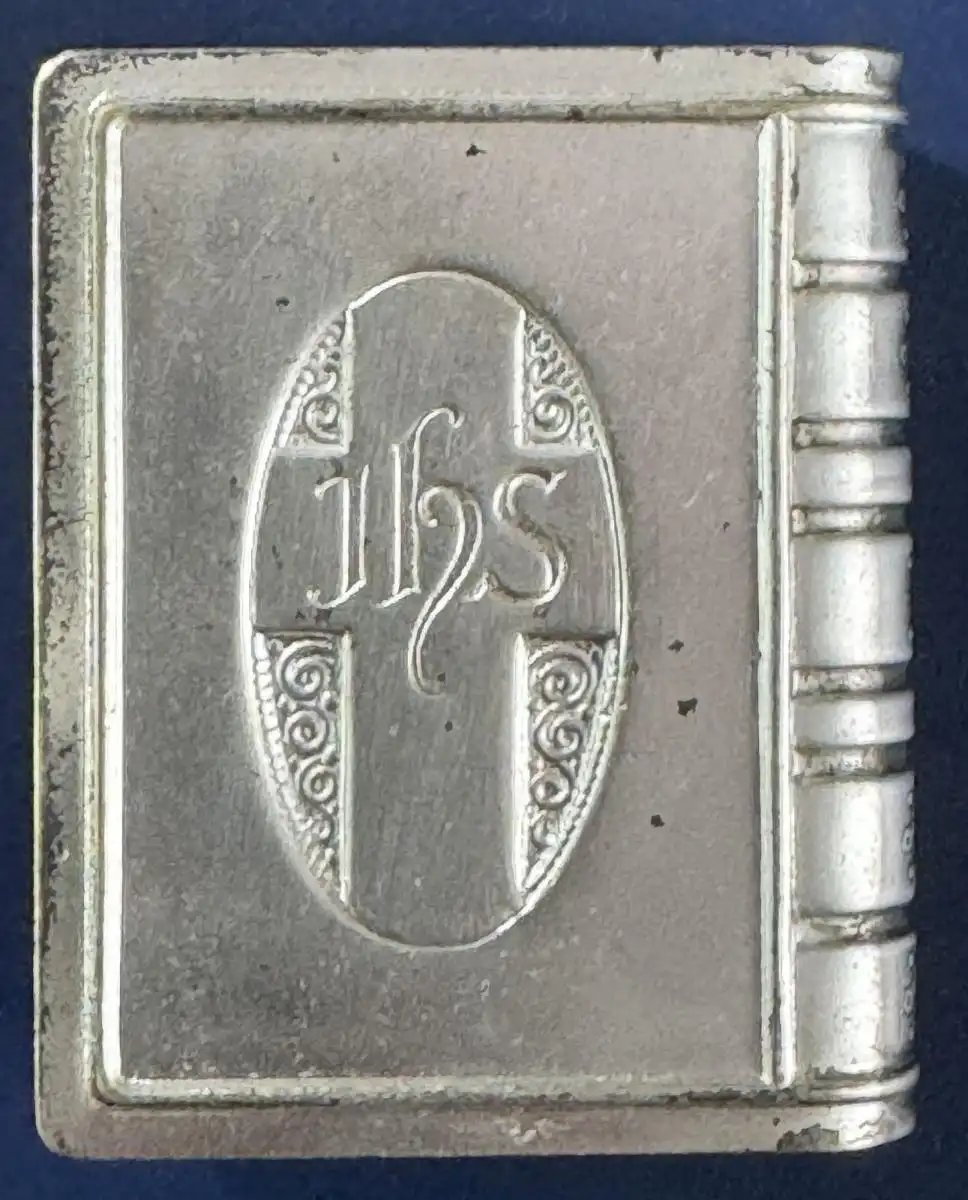 Schatulle in Buchform, Prägung auf der Vorderseite “St. Theresia de Infante Jesu”, versilbert, Maße H 5,2 cm, B 4,2 cm, T 1,3 cm, Gewicht incl. Rosenkranz 29 Gramm.