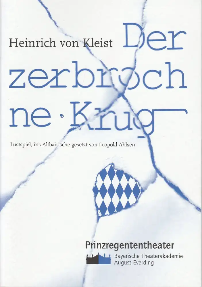 Lustspiel von Heinrich von Kleist, ins Altbairische gesetzt von Leopold Ahlsen. Inszenierung: Michael Lerchenberg. Ausstattung: Katia Salzbrenner. Mitwirkende: Jörg Hube, Monika Baumgartner, Norbert Mahler, Markus Baumeister, Stephanie Keller, Barbara Lackermeier, Barbara Lucia Bauer, Thomas Birnstiel, Doris Buchrucker, Wolfram Kunkel, Jo Vollrath - Schlüsselwörter: Theaterprogramm, Opernprogramm, Ballettprogramm, Musicalprogramm, Konzertprogramm, Theatermemorabilia, Programmhefte Sammlung, deutsche Theatergeschichte.