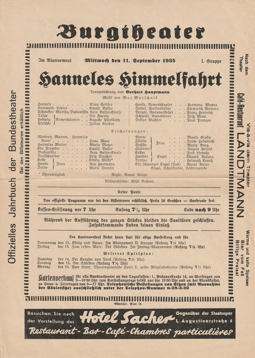 Traumdichtung von Gerhart Hauptmann. Musik von Max Marschall. Regie: Raoul Aslan. Bühnenbilder: Willi Bahner. Mitwirkende: Alma Seidler, Ewald Balser,Vera Balser-Eberle, Emmerich Reimers, Fritz Blum, Franz Herterich, u. a. - Theaterprogramm, Opernprogramm, Ballettprogramm, Musicalprogramm, Konzertprogramm, Theatermemorabilia, Programmhefte Sammlung, deutsche Theatergeschichte.