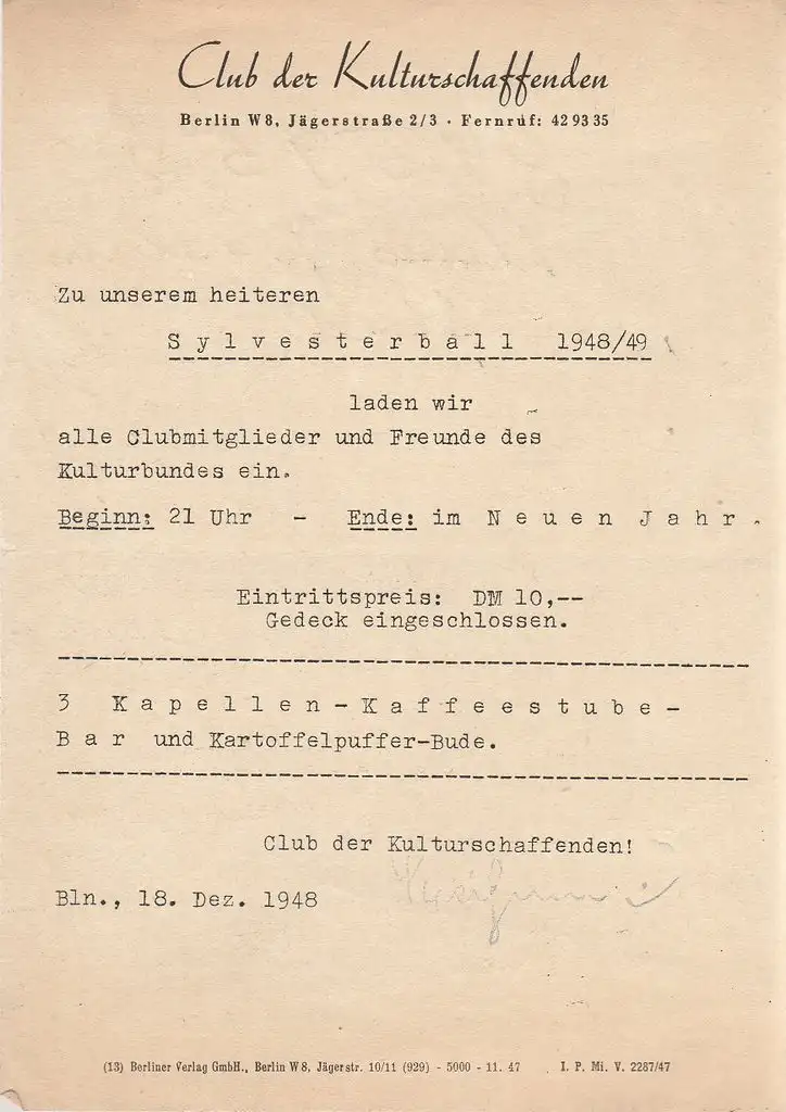 Titel:Einladungszettel CLUB DER KULTURSCHAFFENDEN SYLVESTERBALL 1948 / 49
