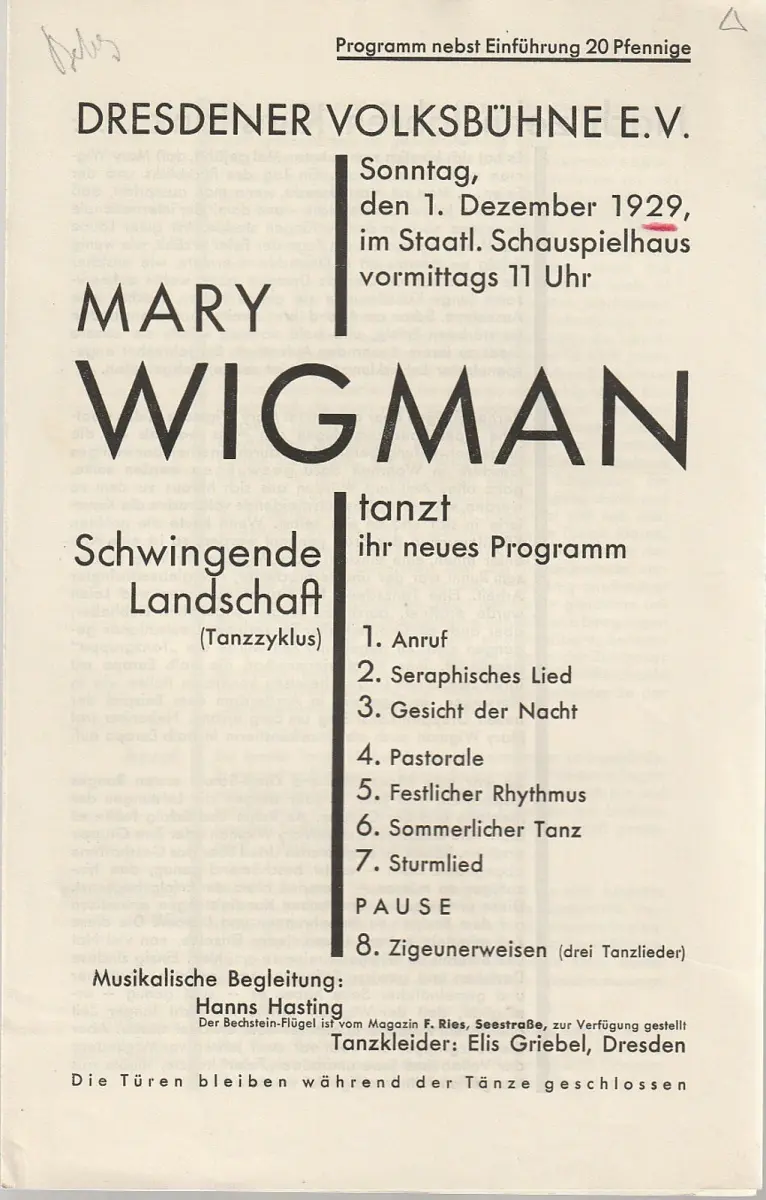 Dresdener Volksbühne E.V: Programmheft MARY WIGMAN SCHWINGENDE LANDSCHAFTEN 1. Dezember 1929 Staatl. Schauspielhaus.