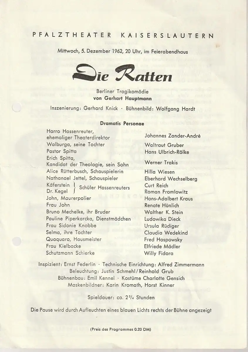 Berliner Tragikomödie. Inszenierung: Gerhard Knick. Bühne: Wolfgang Hardt. Mitwirkende: Johannes Zander-Andre, Waltraut Gruber, Hans Ulbrich-Rölke, Werner Trakis, Hilla Wiesen, Eberhard Wechselberg, Curt Reich, Roman Fromlowitz, u.a. - Theaterprogramm, Opernprogramm, Ballettprogramm, Musicalprogramm, Konzertprogramm, Theatermemorabilia, Programmhefte Sammlung, deutsche Theatergeschichte.