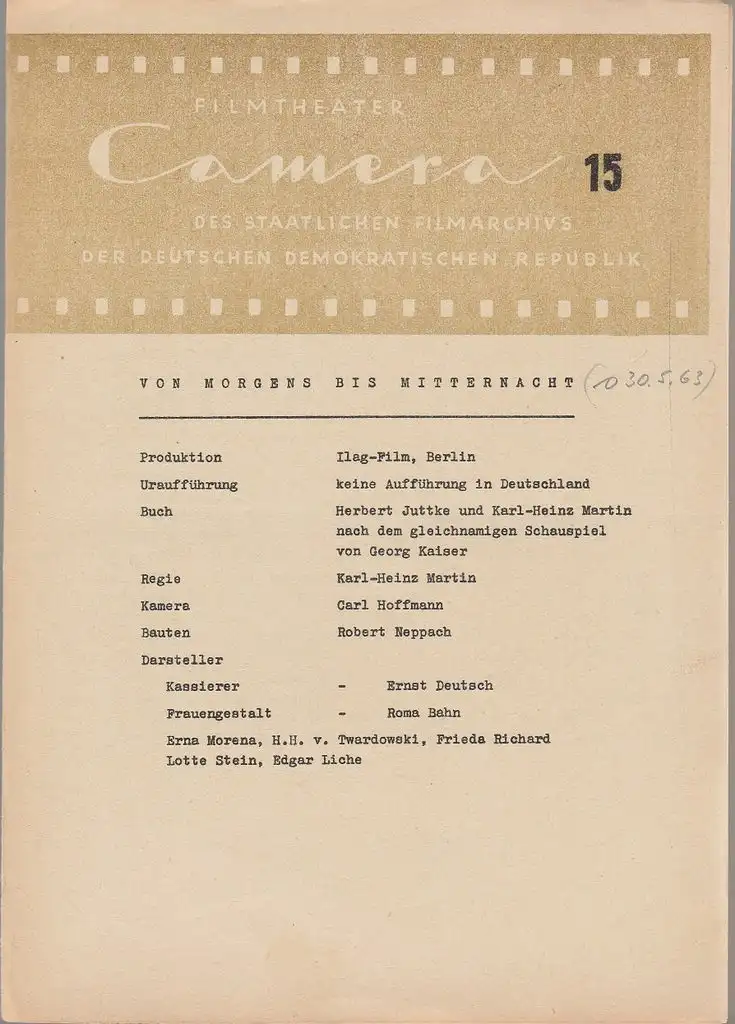 Filmtheater CAMERA des Staatlichen Filmarchivs der Deutschen Demokratischen Republik: Programmheft Ilag Film Berlin VON MORGENS BIS MITTERNACHT Heft 15.