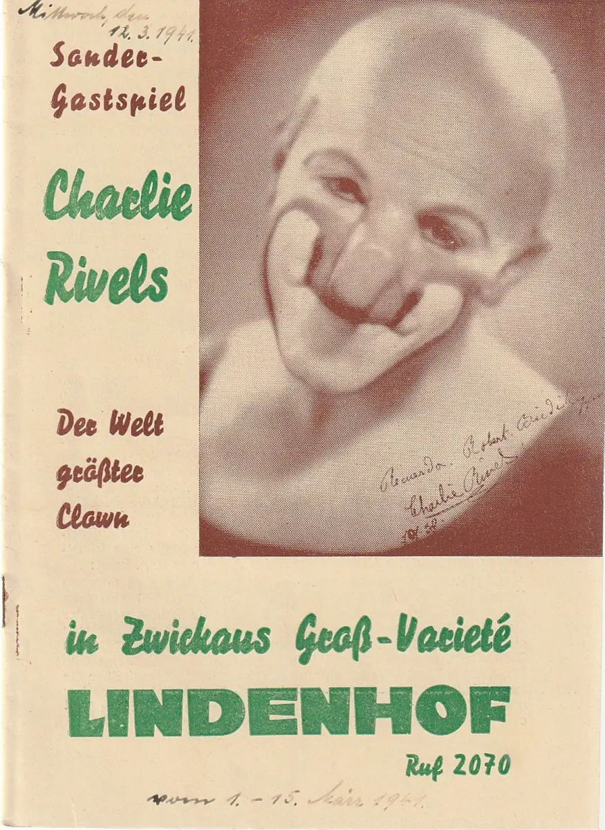 Titel:Programmheft SONDERGASTSPIEL CHARLIE RIVELS Der Welt größter Clown 1. - 15 März 1941 ( Rivel )