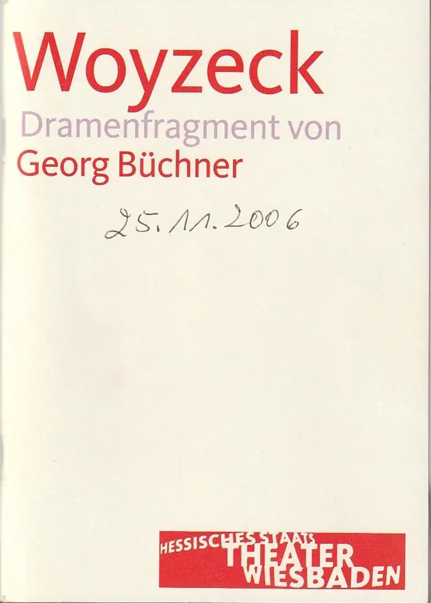 Dramenfragment. Fassung Staatstheater Wiesbaden. Inszenierung: Manfred Beilharz. Bühne und Kostüme: Bernd Holzapfel. Musik: Roman Beilharz. Mitwirkende: Rainer Kühn, Alexandra Finder, Uwe Kraus, Franz Nagler, Lars Wellings, Wolfgang Böhm, Franziska Geyer, Sebastian Muskalla, Benjamin Krämer-Jenster, Jan Käfer, Lukas Althaus / Jakob Kaltwasser, u.a. - Theaterprogramm, Opernprogramm, Ballettprogramm, Musicalprogramm, Konzertprogramm, Theatermemorabilia, Programmhefte Sammlung, deutsche Theatergeschichte.