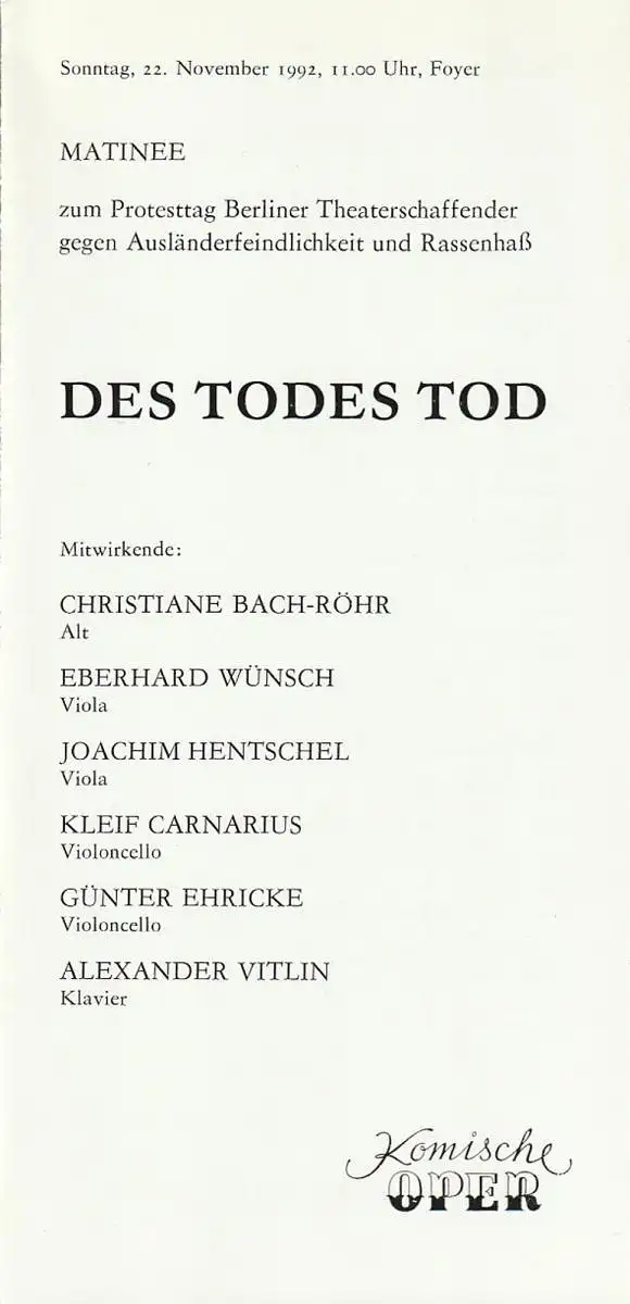 Matinee zum Protesttag Berliner Theaterschaffender gegen Ausländerfeindlichkeit und Rassenhaß. Mitwirkende: Christiane Bach-Röhr, Alt / Eberhard Wünsch, Viola / Joachim Hentschel, Viola / Kleif Canarius, Günter Ehricke, Violoncello / Alexnder Vitlin, Klavier. Programm: FRANZ SCHUBERT: Sonate für Viola und Klavier a-Moll, D 821 ( Arpeggione-Sonate ). LUDWIG VAN BEETHOVEN: Sonate für Klavier und Violoncello C-Dur, op. 102, Nr. 1. PAUL HINDEMITH: Des Todes Tod. Drei Lieder nach Gedichten von Eduard Reinacher für Frauenstimme, zwei Bratschen und zwei Violoncelli, op. 23a - Theaterprogramm, Opernprogramm, Ballettprogramm, Musicalprogramm, Konzertprogramm, Theatermemorabilia, Programmhefte Sammlung, deutsche Theatergeschichte.