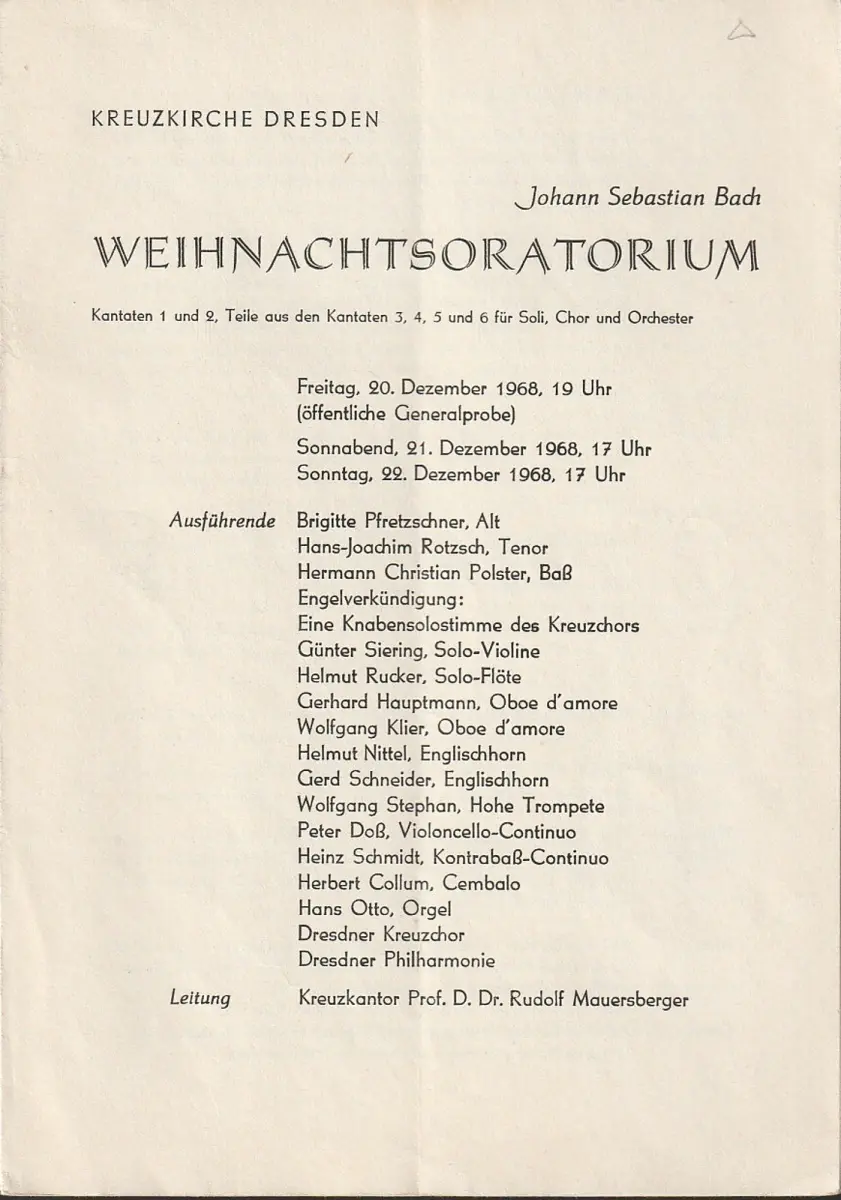 Leitung: Kreuzkantor Rudolf Mauersberger. Ausführende: Brigitte Pfretzschner, Alt / Hans-Joachim Rotzsch, Tenor / Hermann Christian Polster, Baß / Engelsverkündung: Eine Knabensolostimme des Kreuzchors. Dresdner Philharmonie, div. Solo-Instrumentalisten, Dresdner Kreuzchor und Dresdner Philharmonie. Programm: Kantaten 1 und 2, Teile aus den Kantaten 3,4,5 und 6 für Soli, Chor und Orchester. - Theaterprogramm, Opernprogramm, Ballettprogramm, Musicalprogramm, Konzertprogramm, Theatermemorabilia, Programmhefte Sammlung, deutsche Theatergeschichte.