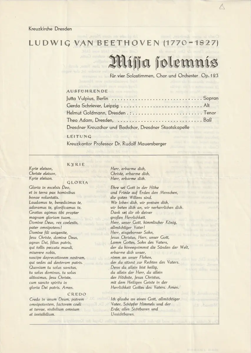 Für vier Solostimmen, Chor und Orchester, op. 123. Ausführende: Jutta Vulpius, Sopran / Gerda Schriever, Alt / Helmut Goldmann, Tenor / Theo dam, Baß. Dresdner Kreuzchor und Bachchor, Dresdner Staatskapelle. Leitung: Rudolf Mauersberger - Theaterprogramm, Opernprogramm, Ballettprogramm, Musicalprogramm, Konzertprogramm, Theatermemorabilia, Programmhefte Sammlung, deutsche Theatergeschichte.