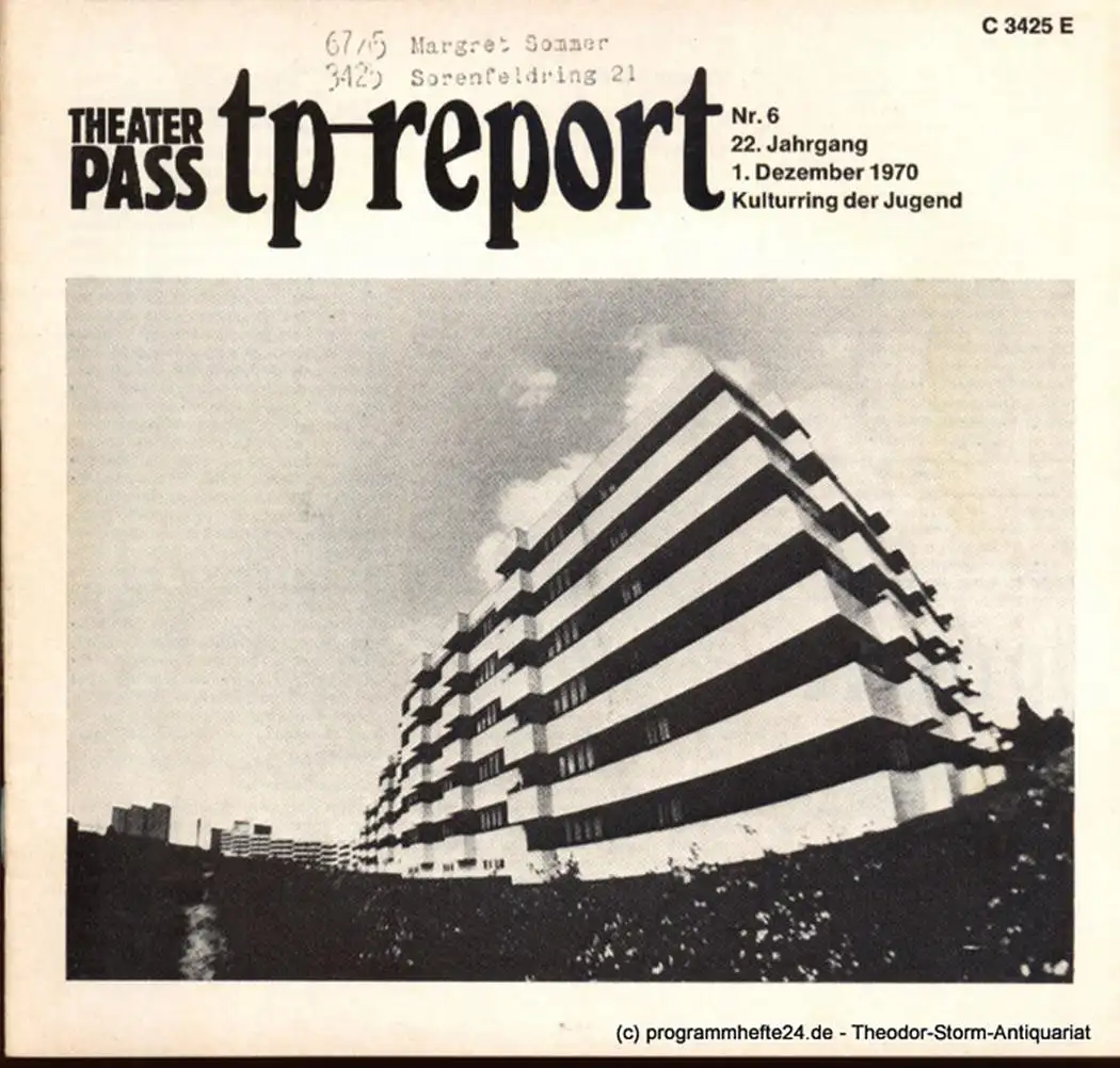 Kulturring der Jugend, Janza Werner, Reinke Heinz A., Rogge Heiko: Theaterpaß. tp-report Nr. 6 22. Jahrgang 1. Dezember 1970 ( Unsere Stadt ).