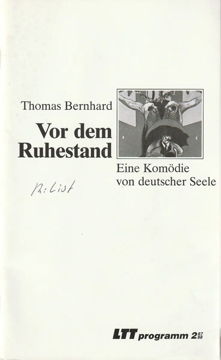 Landestheater Württemberg-Hohenzollern (LTT), Bernd Leifeld, Wolfram Frank: Programmheft Thomas Bernhard VOR DEM RUHESTAND Premiere 19. September 1987 Spielzeit 1987 / 88.