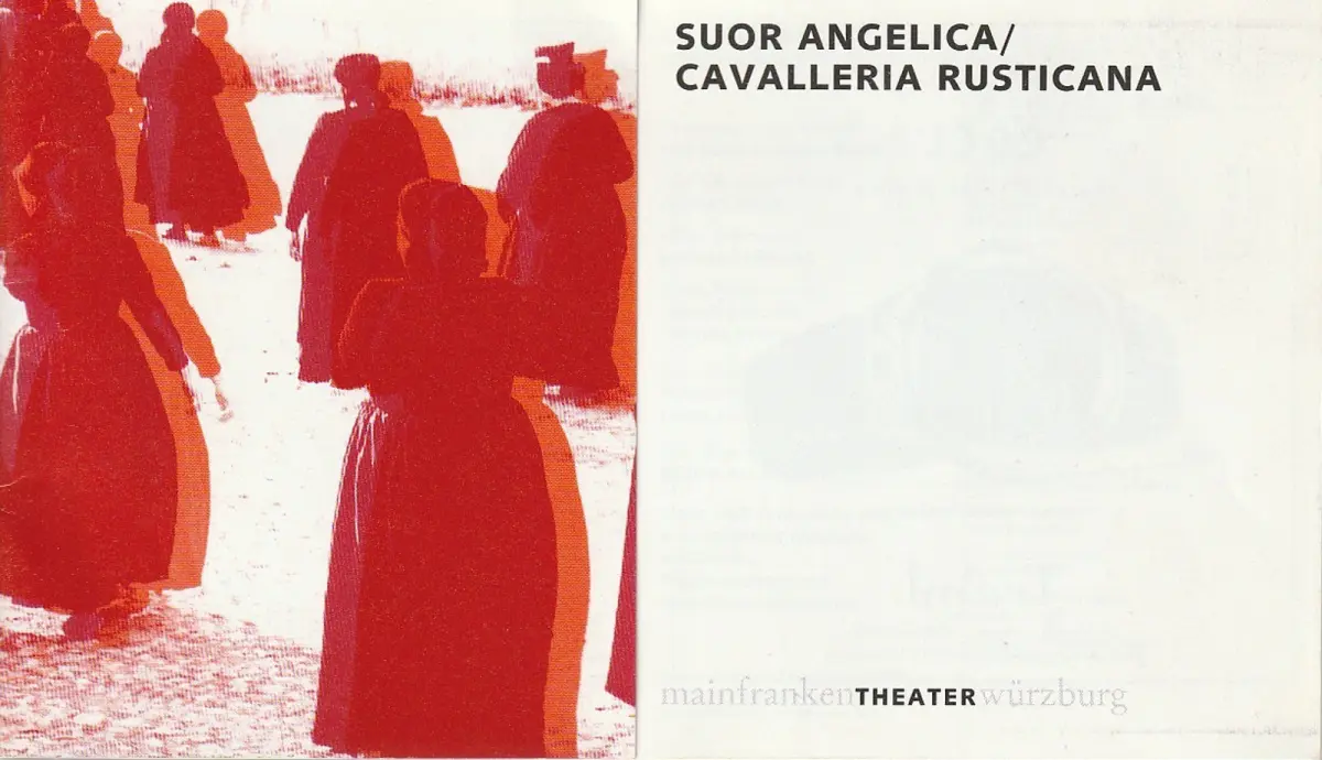 Musikalische Leitung: Daniel Klajner. Regie: Robert Lehmeier. Bühne und Kostüme: Tom Musch. SUOR ANGELICA: Oper in einem Akt. Mitwirkende: Elizabeth Hagedorn, Janina Baechle / Daphne Becka, Andrea Berlet, Ulrike Kobalz / Linda Laible, Monika Eckhoff, u. a. CAVALLERIA RUSTICANA: Melodram in einem Aufzug. Mitwirkende: Veronika Diefenbacher, Gilbert Mata, Michael Berning, Janina Baechle / Daphne Becka, Katina Palermo, u. a. - Theaterprogramm, Opernprogramm, Ballettprogramm, Musicalprogramm, Konzertprogramm, Theatermemorabilia, Programmhefte Sammlung, deutsche Theatergeschichte.