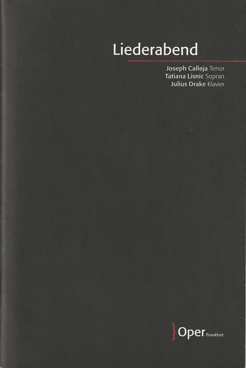 Liederabend mit Joseph Calleja, Tenor / Tatiana Lisnic, Sopran / Julius Drake, Klavier. Programm: Werke von Georg Friedrich Händel, Cristoph Willibald Gluck, Antonio Lotti, Giovanni Paisiello, Giuseppe Gordani, Wolfgang Amadeus Mozart, Gaetano Donizetti, u, a, - Theaterprogramm, Opernprogramm, Ballettprogramm, Musicalprogramm, Konzertprogramm, Theatermemorabilia, Programmhefte Sammlung, deutsche Theatergeschichte.
