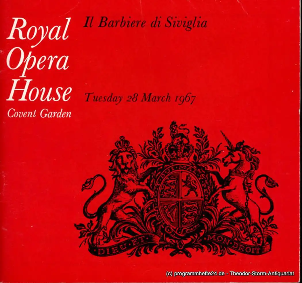 Music by Gioacchino Rossini. text by Cesare Sterbini. Conductor: Silvio Varviso. Production rehearsed by Ande Anderson. Scenery and costumes by Jean-Denis Malcles. Chorus Master: Douglas Robinson. The Covent Garden Orchestra Leader: Charles Taylor - Theaterprogramm, Opernprogramm, Ballettprogramm, Musicalprogramm, Konzertprogramm, Theatermemorabilia, Programmhefte Sammlung, deutsche Theatergeschichte.