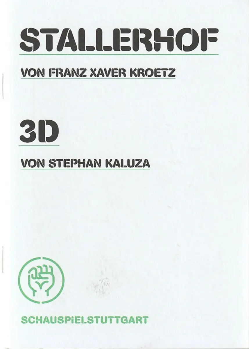 Franz Xaver Kroetz: STALLERHOF / Stephan Kaluza Uraufführung 3D. Regie: Stephan Kimmig. Bühne und Video: Oliver Helf. Kostüme: Annelies Vanlaere. Mitwirkende Stallerhof: Sebastian Kowski, Marietta Meguid, Silja Bächli, Martin Leutgeb / Mitwirkende 3D: Elmar Roloff, Minna Wündrich - Theaterprogramm, Opernprogramm, Ballettprogramm, Musicalprogramm, Konzertprogramm, Theatermemorabilia, Programmhefte Sammlung, deutsche Theatergeschichte.