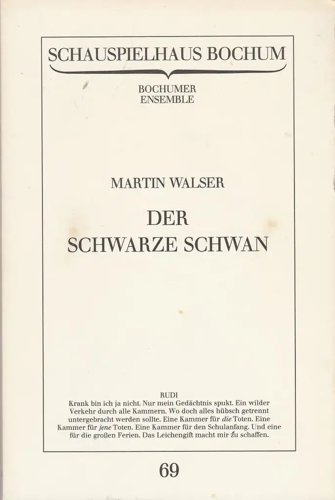 Schauspielhaus Bochum, Bochumer Ensemble, Claus Peymann, Vera Sturm: Programmheft Martin Walser DER SCHWARZE SCHWAN Premiere 11. Oktober 1985 Kammerspiele Spielzeit 1985 / 86 Programmbuch Nr. 69.