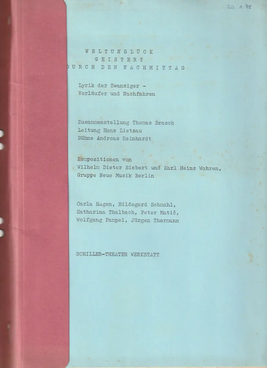 LYRIK DER ZWANZIGER - VORLÄUFER UND NACHFAHREN. Zusammenstellung: Thomas Brasch. Leitung: Hans Lietzau. Bühne: Andreas Reinhardt. Kompositionen von Wilhelm Dieter Siebert und Karl Heinz Wahren, Gruppe Neue Musik Berlin. Mitwirkende: Carla Hagen, Hildegard Schmahl, Katharina Thalbach, Peter Matic, Wolfgang Pampel, Jürgen Thormann - Theaterprogramm, Opernprogramm, Ballettprogramm, Musicalprogramm, Konzertprogramm, Theatermemorabilia, Programmhefte Sammlung, deutsche Theatergeschichte.
