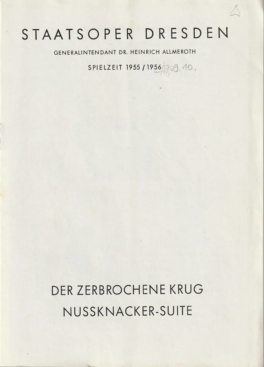 Musikalische Leitung: Joachim Freyer. Choreographie: Erwin Hansen. DER ZERBROCHENE KRUG Ballett nach Kleist. Musik von Rudolf Wagner-Regeny. Inszenierung: Erwin Hansen. Gesamtausstattung: Karl von Appen. Mitwirkende: Hans-Werner Schmid, Gerhard Viertel, Harry Peukert, Lya Forker, Edith Löffler,u. a. NUßKNACKERSUITE Musik von Peter Iljitsch Tschaikowsky. Ausstattung: Erika Simmank. Mitwirkende: Inge Preusche, Edith Löffler, Gerhard Viertel, Dieter Kraatz, Siegfried Götz, u. a. - Theaterprogramm, Opernprogramm, Ballettprogramm, Musicalprogramm, Konzertprogramm, Theatermemorabilia, Programmhefte Sammlung, deutsche Theatergeschichte.