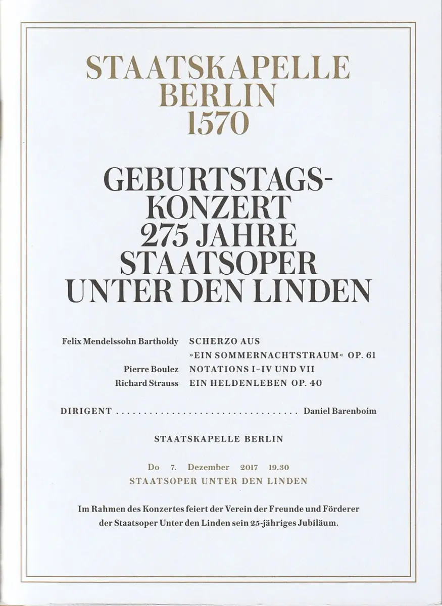 Dirigent: Daniel Barenboim. Programm: Prof. Jürgen Flimm: Begrüssung / Michael Müller, Regierender Bürgermeister von Berlin: Berlin gratuliert / Prof. Dr. Norbert Lammert: Herzliche Glückwünsche / Felix Mendelssohn Bartholdy: Scherzo aus der Musik zu Shakespeares Ein Sommernachtstraum op. 61 7 Pierre Boulez: Notations I-IV und VII für Orchester / Richard Strauss: Ein Heldenleben op. 40. Solo-Violine: Jiyoon Lee - Theaterprogramm, Opernprogramm, Ballettprogramm, Musicalprogramm, Konzertprogramm, Theatermemorabilia, Programmhefte Sammlung, deutsche Theatergeschichte.