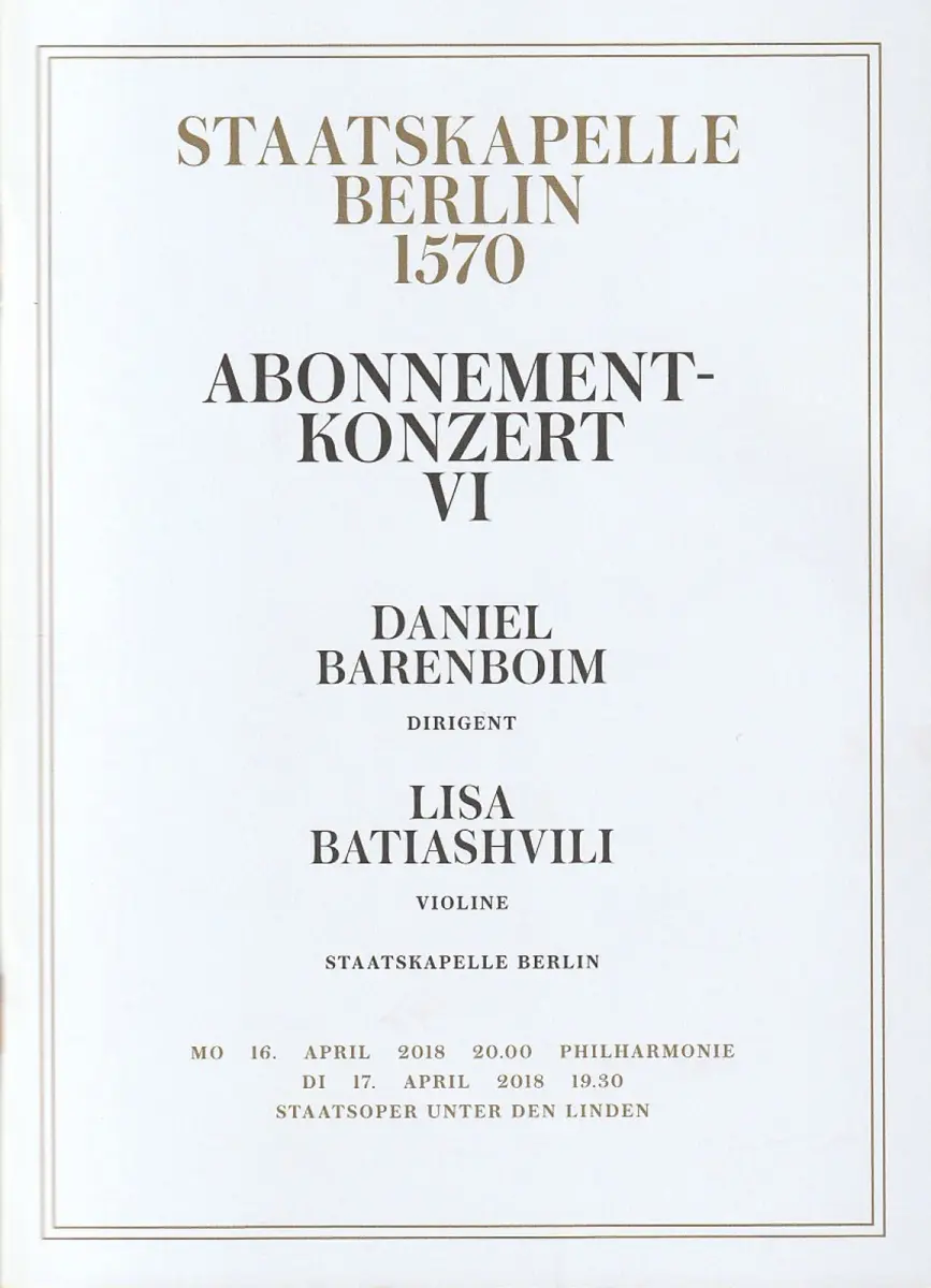 Staatsoper Unter den Linden, Staatskapelle Berlin 1570, Daniel Barenboim, Detlef Giese: Programmheft ABONNEMENTKONZERT VI 16. April 2018.