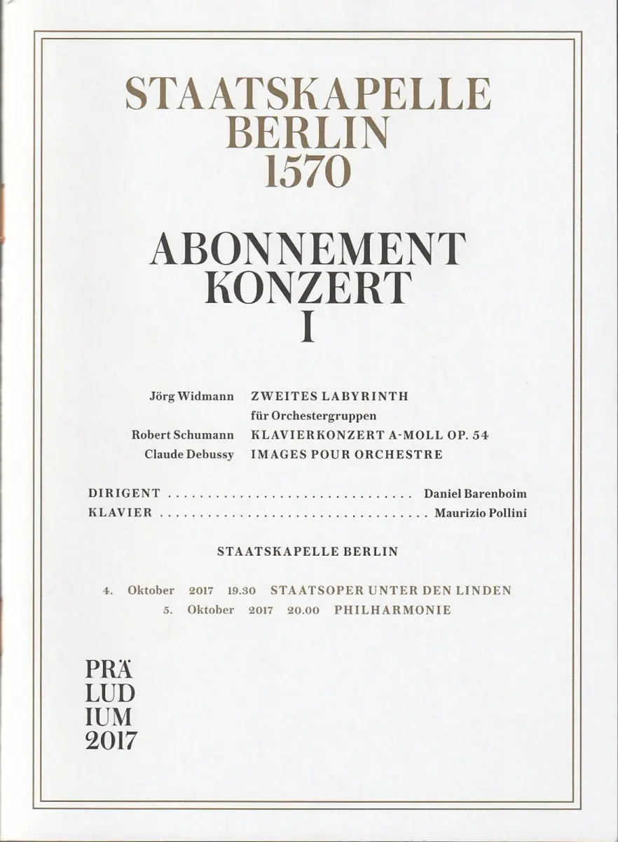 Dirigent: Daniel Barenboim. Mitwirkende: Maurizio Pollini, Klavier. Programm: Jörg Widmann: Zweites Labyrinth für Orchestergruppen / Robert Schumann: Klavierkonzert a-Moll op. 54 / Claude Debussy: Images pour Orchestre - Theaterprogramm, Opernprogramm, Ballettprogramm, Musicalprogramm, Konzertprogramm, Theatermemorabilia, Programmhefte Sammlung, deutsche Theatergeschichte.