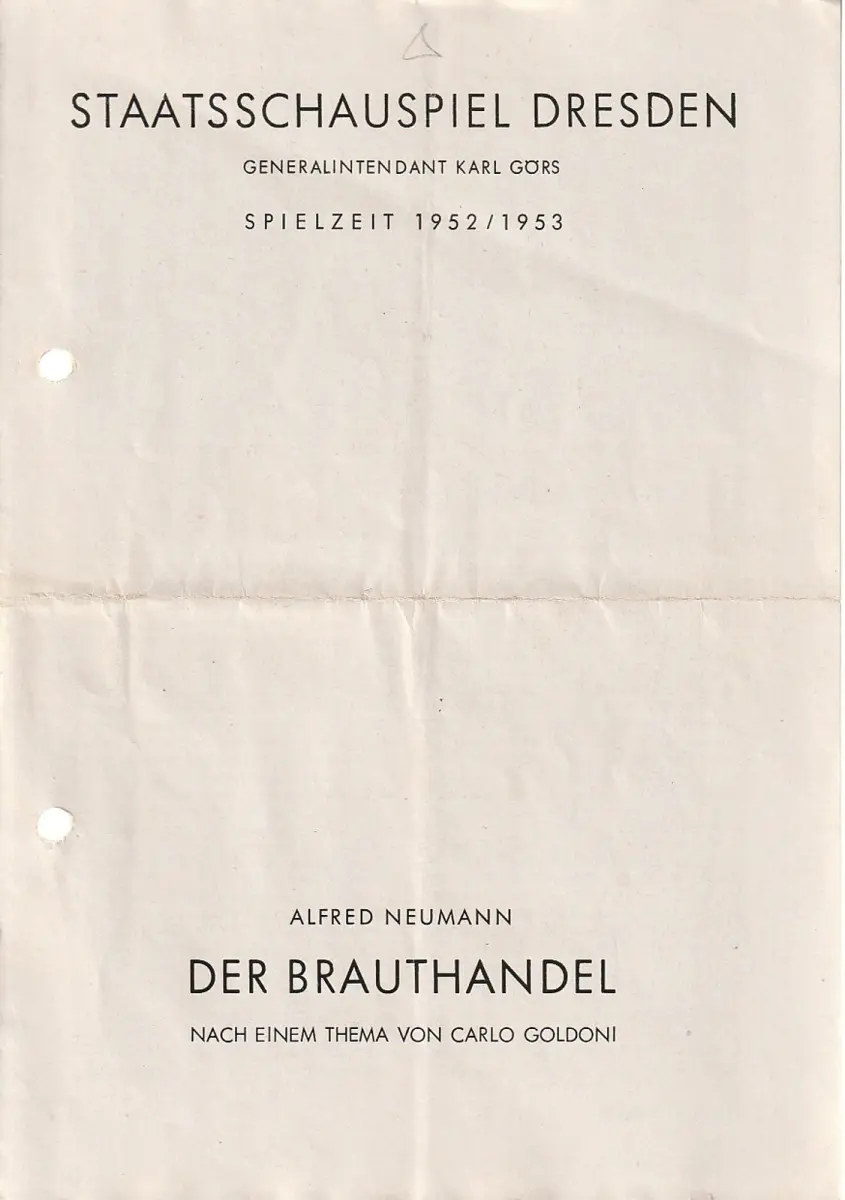 Komödie in drei Akten. Nach einem Thema von Carlo Goldoni. Regie: Werner Simon. Ausstattung: Artur Jähnichen. Mitwirkende: Kurt Steingraf, Traute Richter, Otto Stark, Ulrich von der Trenck, Helga Göring, Peter Herden, u. a. - Theaterprogramm, Opernprogramm, Ballettprogramm, Musicalprogramm, Konzertprogramm, Theatermemorabilia, Programmhefte Sammlung, deutsche Theatergeschichte.