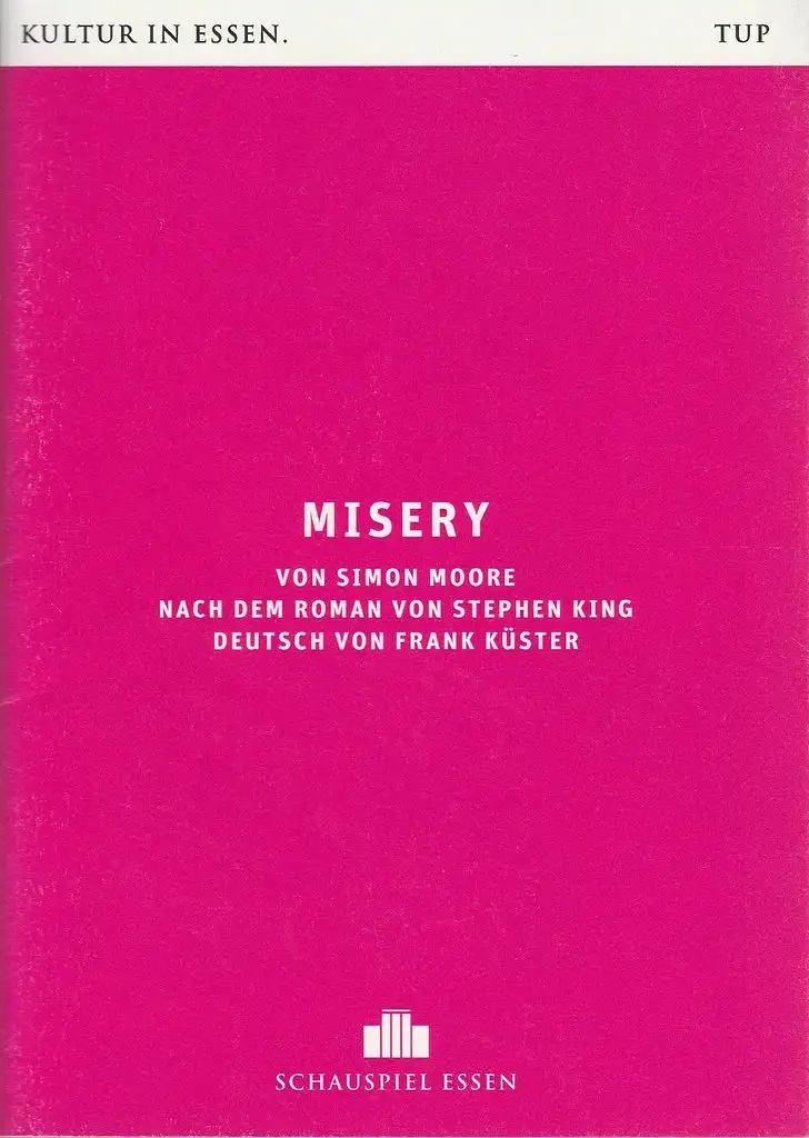 nach dem Roman von Stephen King. Inszenierung: Thomas Goritzki. Bühne und Kostüme: Heiko Mönnich. Mitwirkende: Sven Seeburg, Ines Krug. - Schlüsselwörter: Theaterprogramm, Opernprogramm, Ballettprogramm, Musicalprogramm, Konzertprogramm, Theatermemorabilia, Programmhefte Sammlung, deutsche Theatergeschichte.
