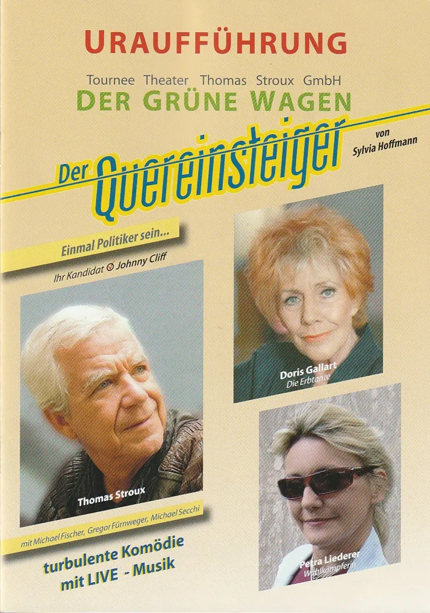 Regie und Tourneefassung: Thomas Stroux. Bühne: Christoph Fath. Musik: Bela Fischer jr.. Kostüme: Andrea Zach. Choreographie: Michael Fischer. Mitwirkende: Thomas Stroux, Petra Liederer, Doris Gallart, Michael Fischer, Gregor Fürnweger, Michael Secchi - Theaterprogramm, Opernprogramm, Ballettprogramm, Musicalprogramm, Konzertprogramm, Theatermemorabilia, Programmhefte Sammlung, deutsche Theatergeschichte.
