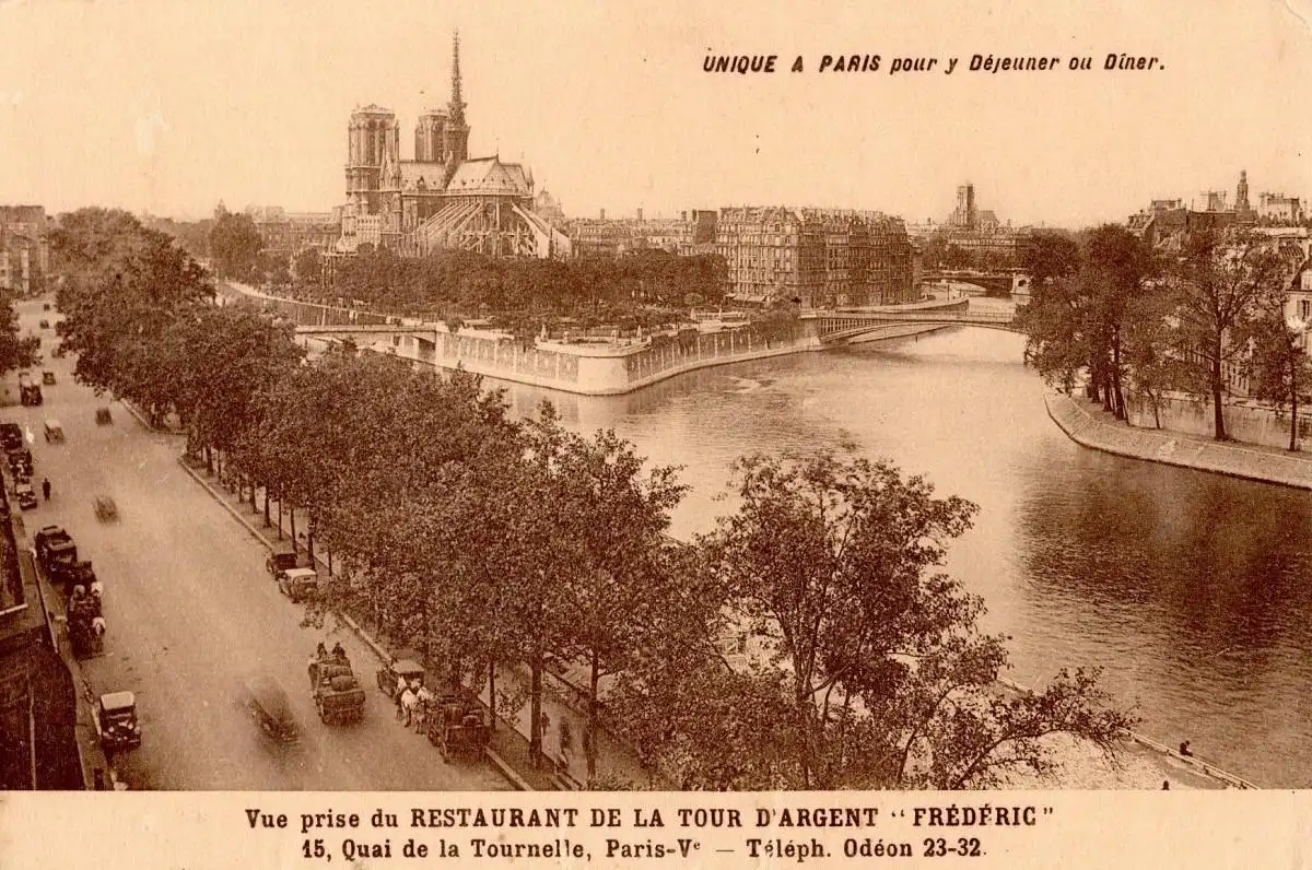 Titel: Paris – Werbepostkarte „La Tour d’Argent“ mit Blick auf Notre-Dame – datiert 1941 – Ansicht vom berühmten Restaurant aus