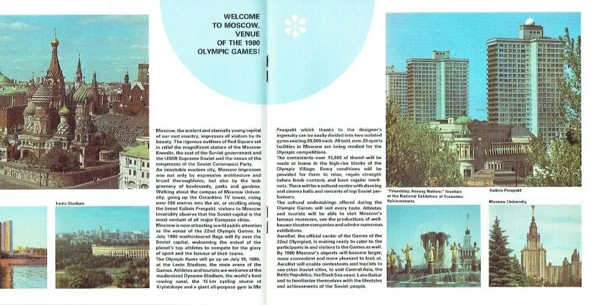 sehr guter Zustand, geringe Gebrauchs- und Alterungsspuren, zur Datierung: die Olympischen Spiele Moskau sind als zukünftig erwähnt, also 1979 oder Anfang 1980 erschienen Werbe-Prospekt der Aeroflot, Softcover, ca. 20 x 18,5, 12 Seiten mit ca. 20 Bildern