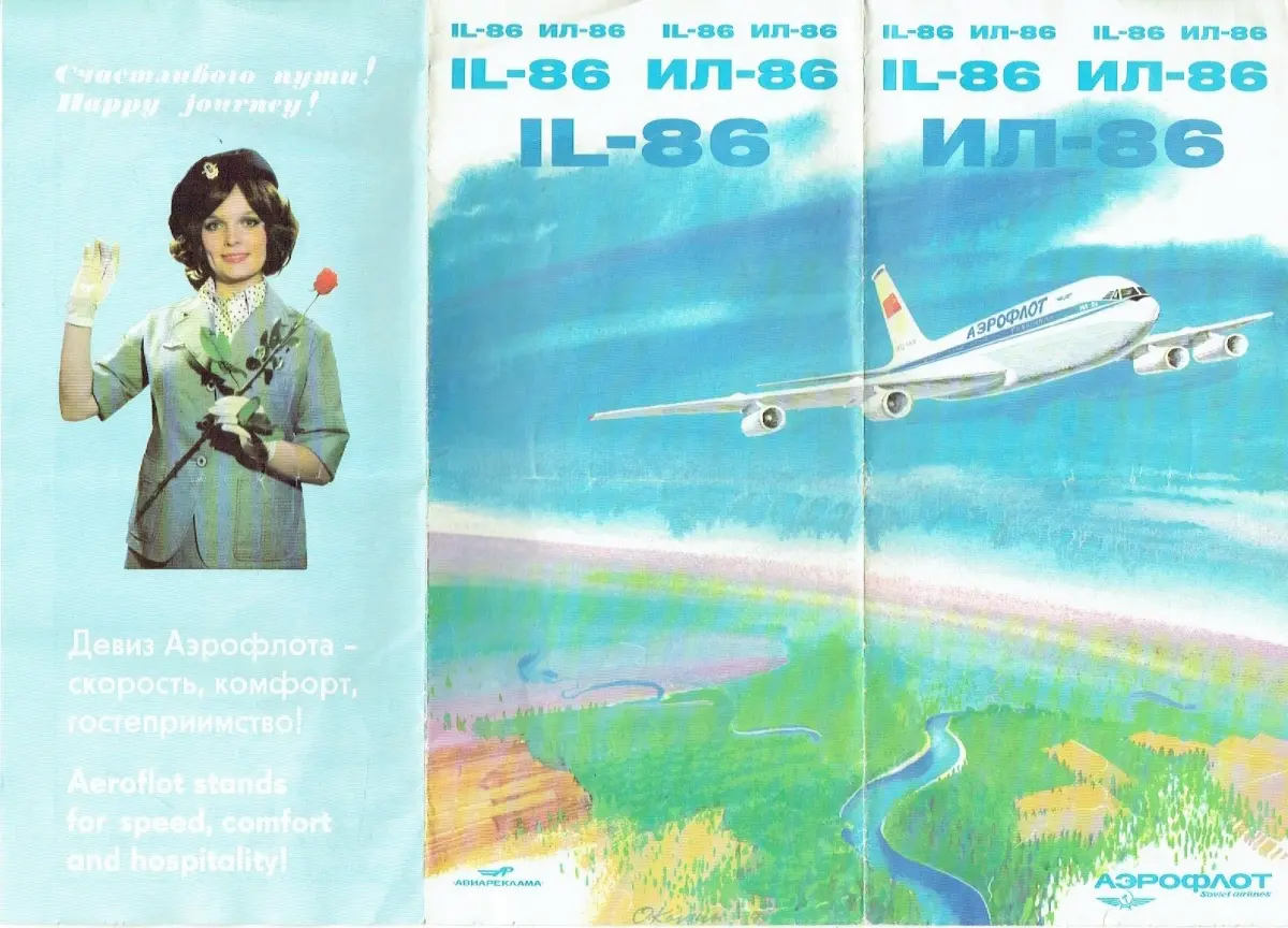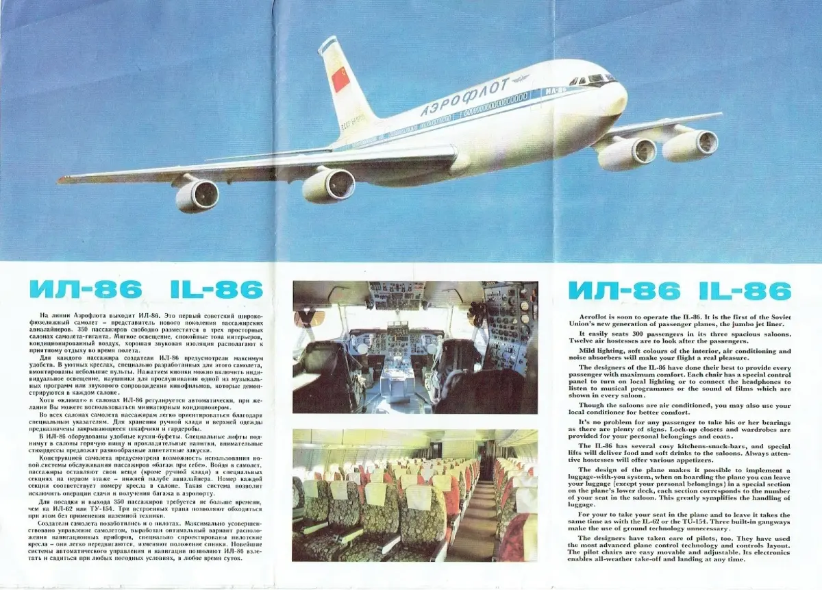 guter Zustand, geringe Gebrauchs- und Alterungsspuren: teils knittrig - mittig quer gefalten, Werbe-Prospekt, der den neuen Jumbo Jet IL-86 beschreibt, Papier, ca. 13,5 x 29 (aufgeklappt ca. 40 x 58), 12 Seiten mit 14 Bildern