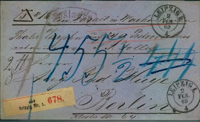 1869, dekorative Paketbegleitung mit Postvorschuss ab LEIPZIG nach Berlin