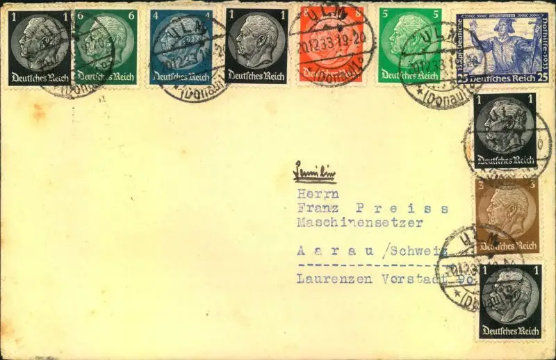 1933, Auslandsbrief ab ULM 20.12.33 mit 25 Pfg. Wagner und 9 Hindenburgwerte in die Schweiz. Katalognummer:506u.a.