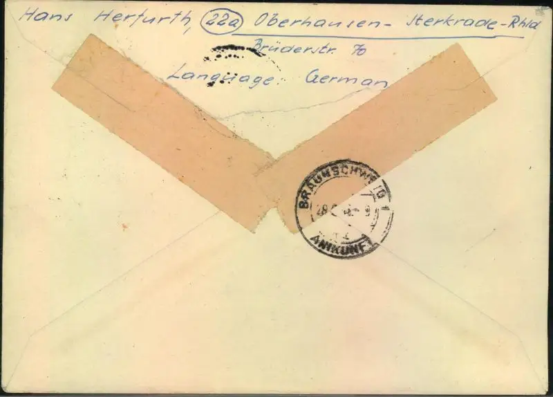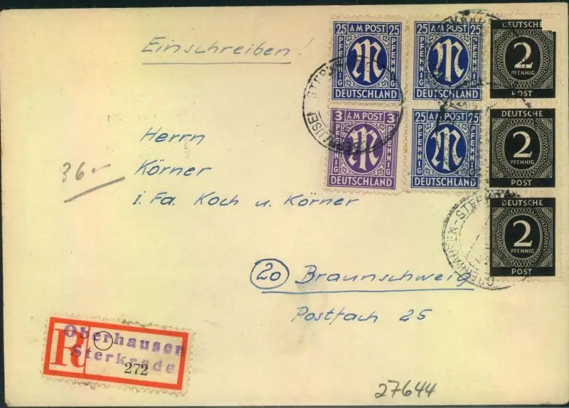 1946, Einschreiben mit Mischfrankatur AM-Post/Ziffer,Not-R-Zettel "Oberhausen Sterkrade"