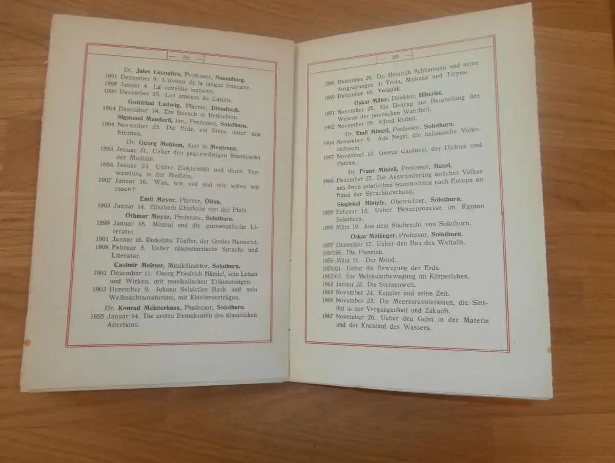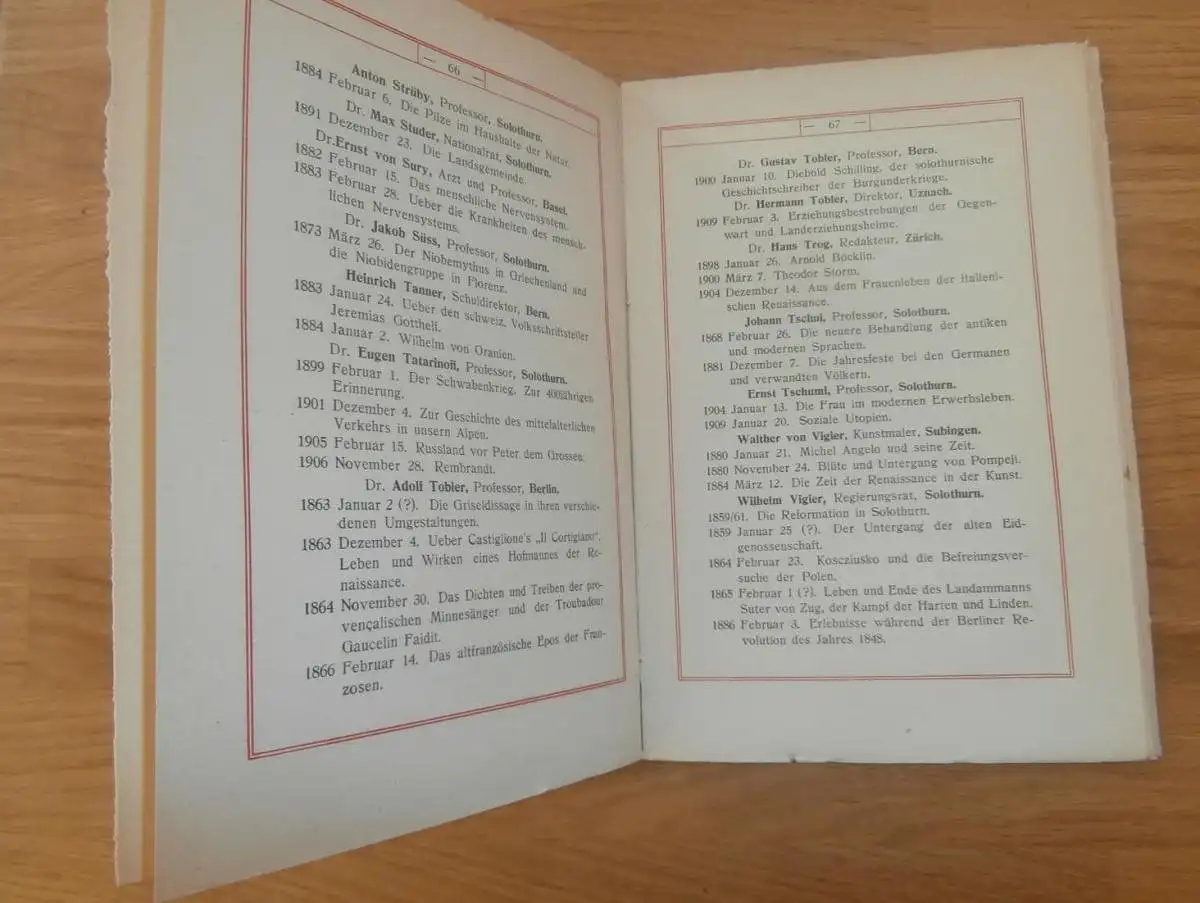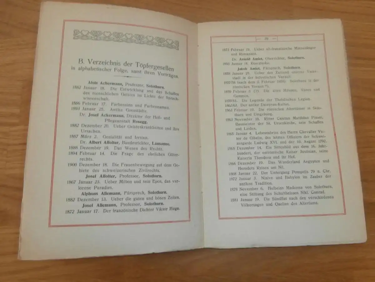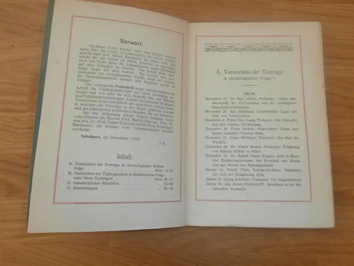 guter Zustand, geringe Gebrauchs- und Alterungsspuren, Seiten sauber und ordentlich - t"Die Töpfergesellschaft Solothurn ist eine 1857 gegründete Vortragsgesellschaft in Solothurn, Schweiz. Durch allgemeinbildende und literarische Vorträge von Persönlichkeiten aus allen Fach- und Lebensbereichen wie Karl Jaspers, Thomas Mann, Günter Grass oder Konrad Lorenz nimmt sie eine wichtige Position unter den Schweizer Vortragsgesellschaften ein." (Wikipedia) - Verzeichnis der Vorträge in chronologischer Reihenfolge - Verzeichnis der Töpfergesellen in alphabetischer Folge samt ihren Vorträgen - Geschichtlicher Rückblick - Anmerkungen