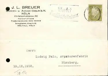 x16046; Funk Stempel: Werdet Rundfunkteilnehmer . Köln 1,19.12.32. auf Firmenkarte Breuer. Köln. Gelocht