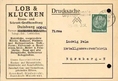 x16133; Messe Stempel: Internationale Leipziger Messe 29.VIII – 2.IX..Duisburg 7.8.38: Auf Firmenkarte Lob und Klucken. Duisburg