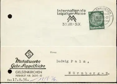 x16135; Messe Stempel: Internationale Leipziger Messe 30.VIII – 3.IX . Gelsenkirchen 1,17.8.36; Auf Firmenkarte Metallwerke Gebr. Seppelfricke. Gelsenkirchen (gelocht).