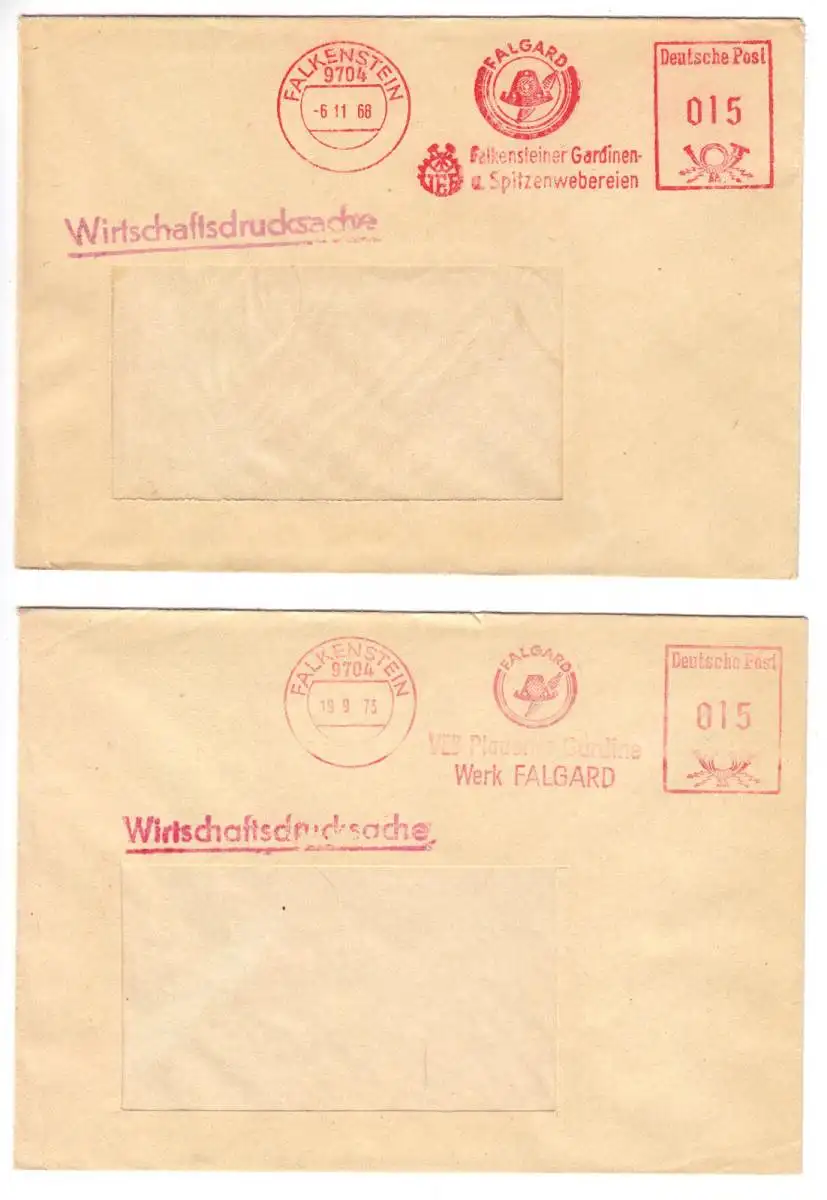 zwei Absenderfreistempel mit verschiedenen Werbungen Abbildungen: Betriebssignet Absender: 1. VEB Falkensteiner Gardinen- u. Spitzenwebereien Empfänger: unbekannt, Fensterbrief Nebenstempel: Wirtschaftsdrucksache Anmerkungen: keine Im Inland erfolgt die Zusendung versandkostenfrei als Briefsendung der Deutschen Post AG oder eines privaten Postanbieters. Auslandsversand