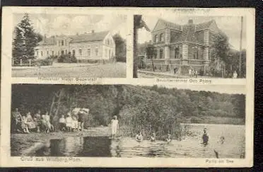 Wildberg, Pommern. Gruss aus. Hofbesitzer Walter Biederstädt, Bauunternehmer Otto Peters, Partie am See. - Gelaufen 1925. Briefmarke entfernt. Kl. Eckknick. (NPLZ 17091)