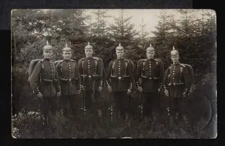 Soldatengruppe mit Waffen. Fotopostkarte. - Gelaufen 1909. (Militär, Soldaten, Uniform).