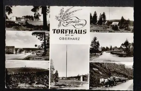 Torfhaus. Gruss vom. Oberharz. 811m. Jugendherberge, Blick vom Goetheweg, Torfhaushotels, Goetheweg, Der Brocken, Fernsehstation, Harzer Langholzwagen - Gelaufen. 1959. (NPLZ 38667) Posiadamy rowniez konto zlotowkowe w Polsce.