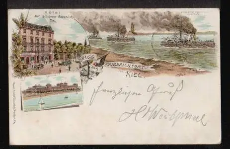 Kiel. Gruss aus Friedrichsort otel zur schönen Aussicht, Einfahrt des Geschawaders in den Hafen, Kaserne - Gelaufen. 1900. Bahnpost. (NPLZ 24100) Posiadamy rowniez konto zlotowkowe w Polsce.