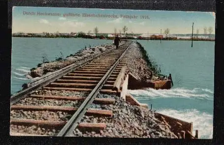 Hochwasser. Durch Hochwasser geführte Eisenbahnstrecke, Frühjahr 1916 - Rückseite mit Text. (Katastrophen)
