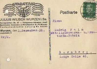 x15893; Firmenkarten; Wurzen i.Sa.. Julius Wilisch. Apparatebau