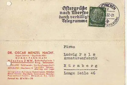 x15907; Firmenkarten; München 2 NW. Dr. Oscar Menzel Nachf. Gummi Fabrikate. Rückseite mit Afkleber: 1897 1937.